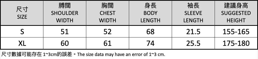 膊寬 x 胸寬 x 身長 x 袖長(cm)// 建議身高